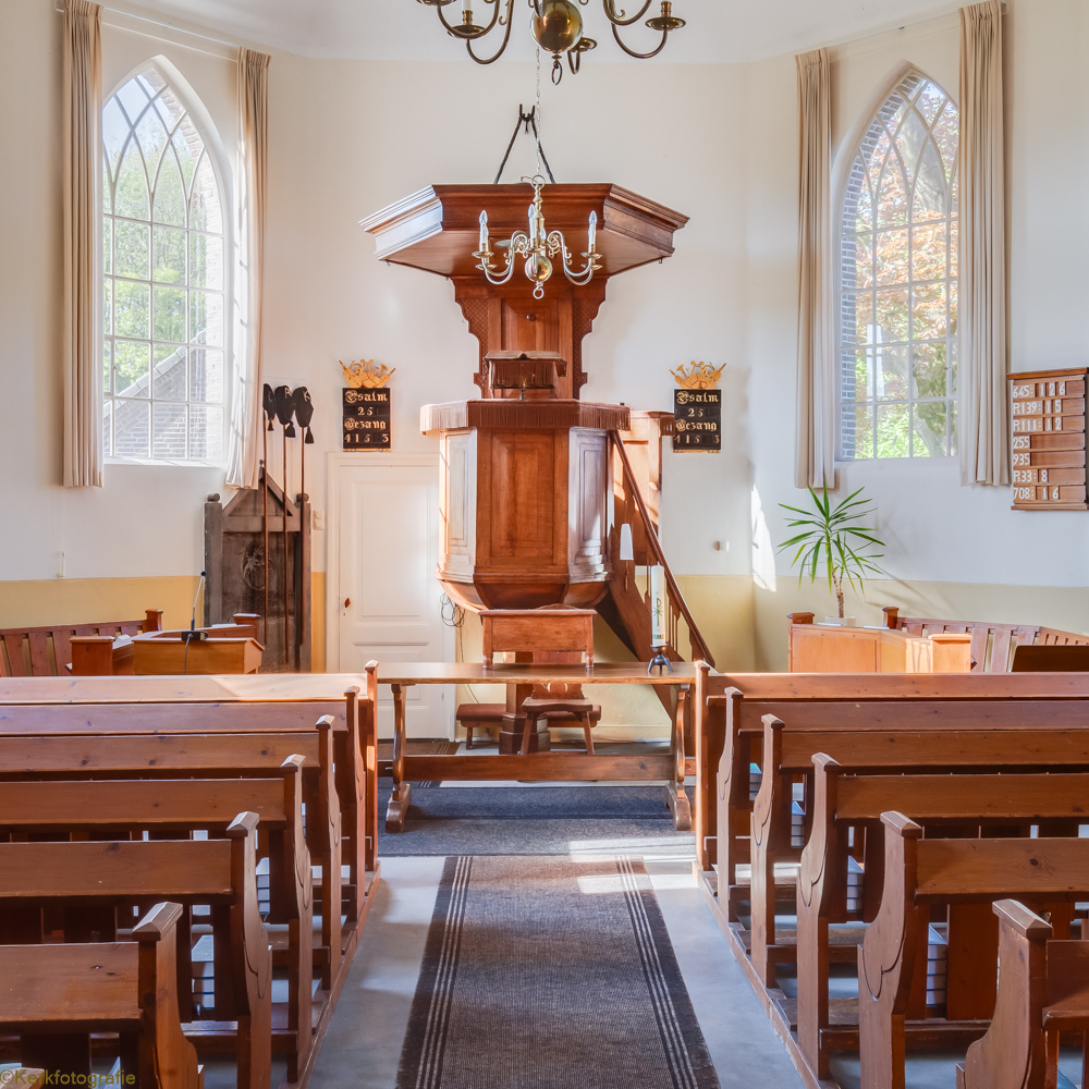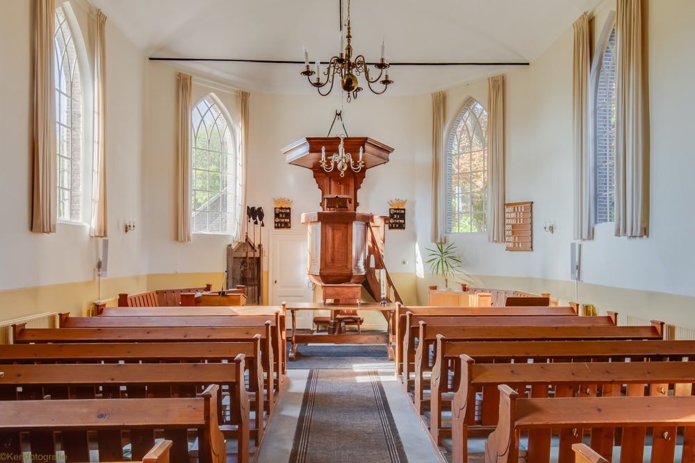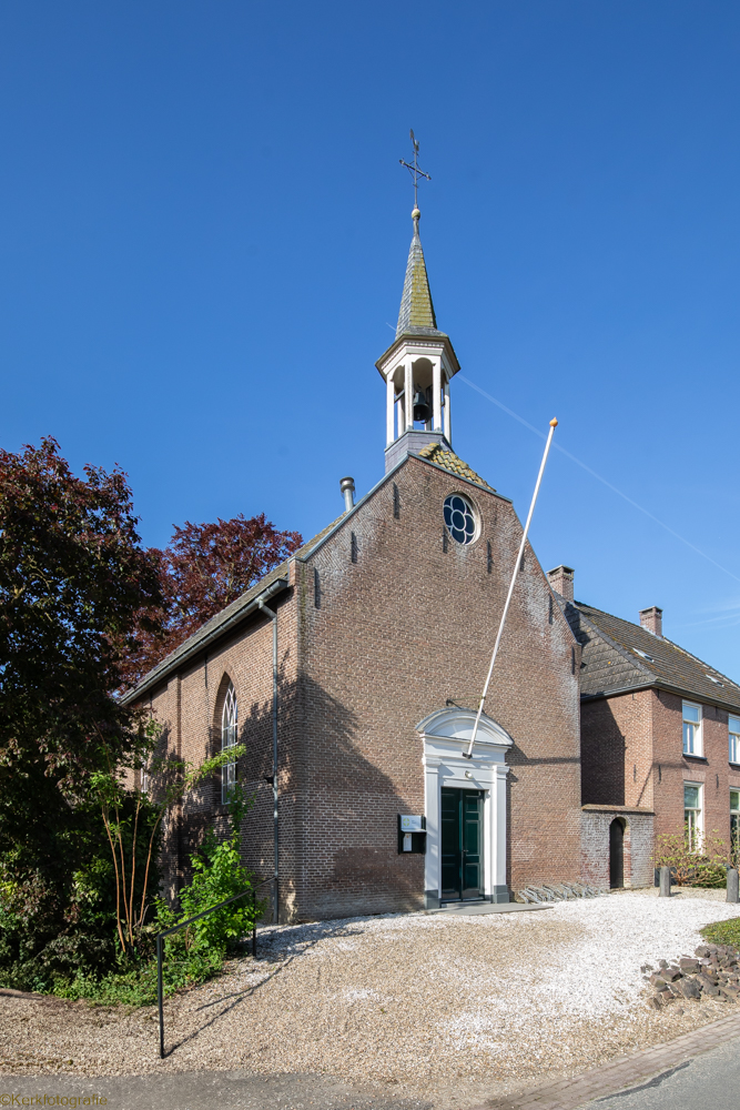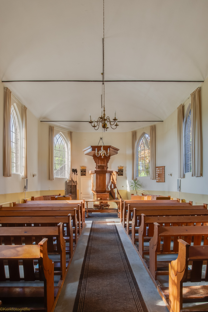 De in 1821 in traditioneel landelijke gebouwde Hervormde Kerk is een driezijdig gesloten zaalkerkje met spitsboogvensters en pannen dak, waarop boven de voorgevel een zeskantig houten klokkentorentje met spits is gebouwd. (Bron: RCE)